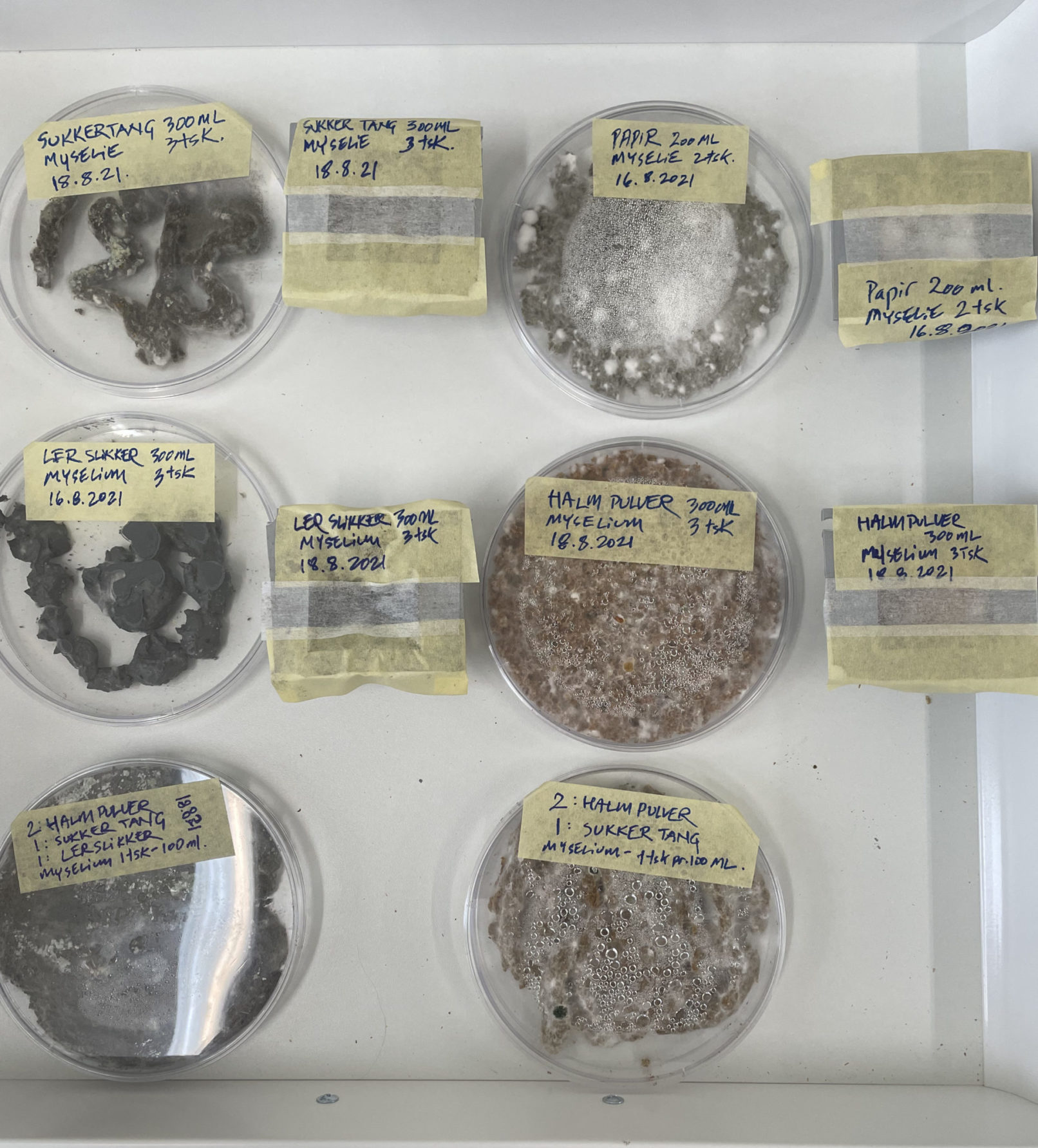 The first initial fase of experimenting with growing mycelium in different materials: straw, seaweed, paper pulp, clay, to experience how it develops, with the aim of finding 3D printable mixes of living material.