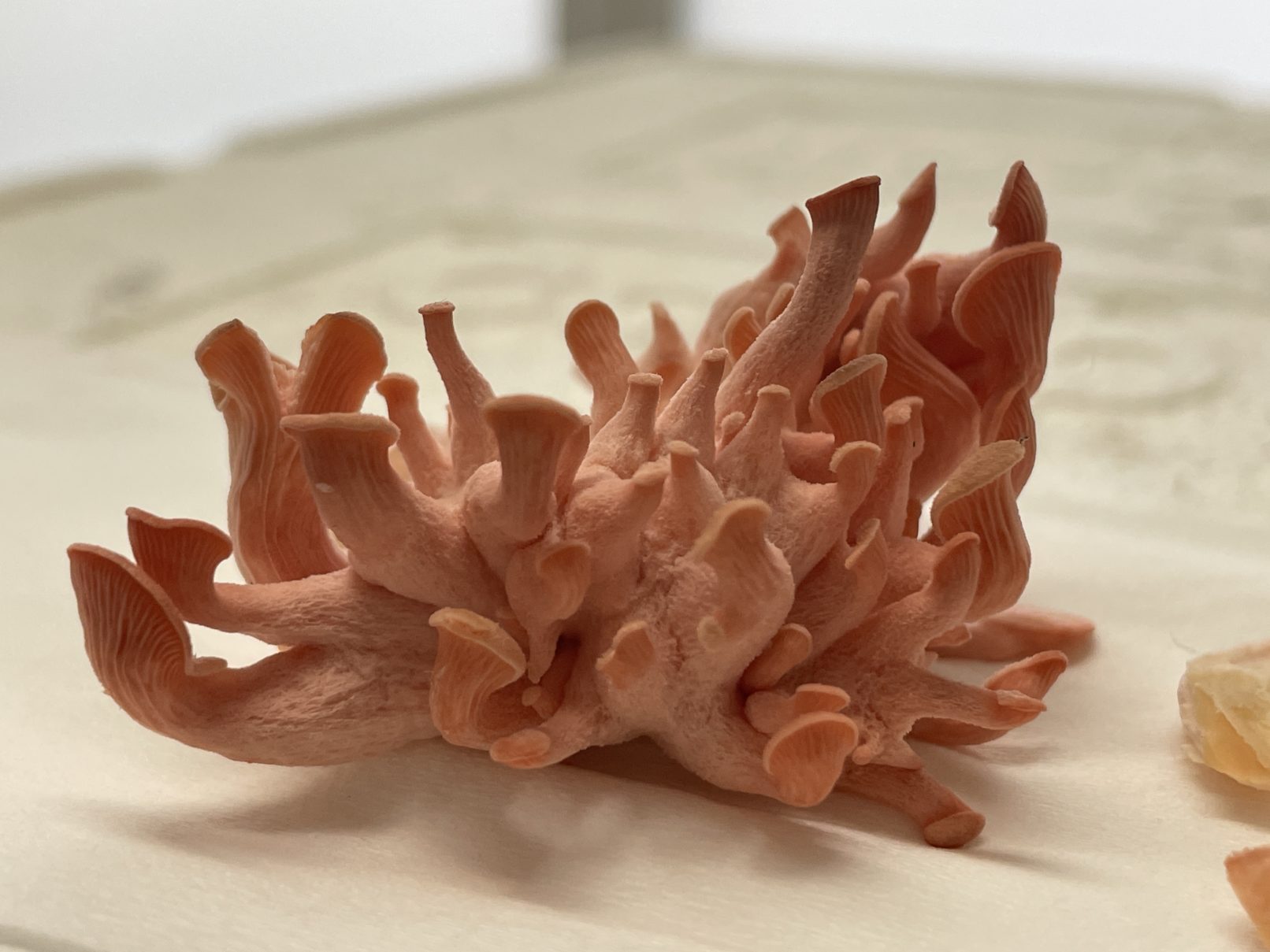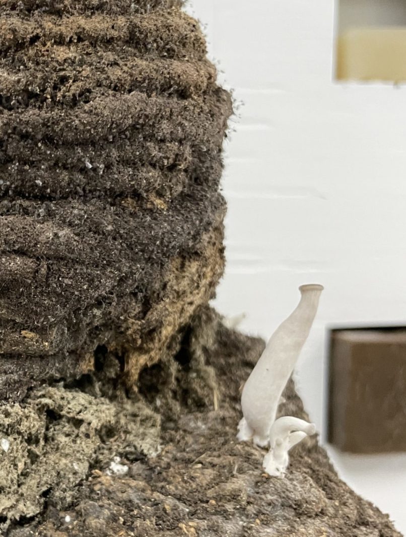 Foreground – Mushroom growing from a mix of mucelium, hemp fibres and clay.